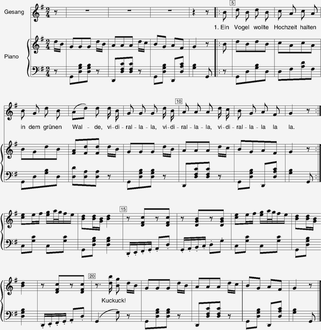 Fiderallala fiderallala fiderallalalala die drossel war der braeutigam die amsel war die braute. Lieder mit text melodie und kostenlosen noten. Ein vogel wollte hochzeit machen in dem gruenen walde.