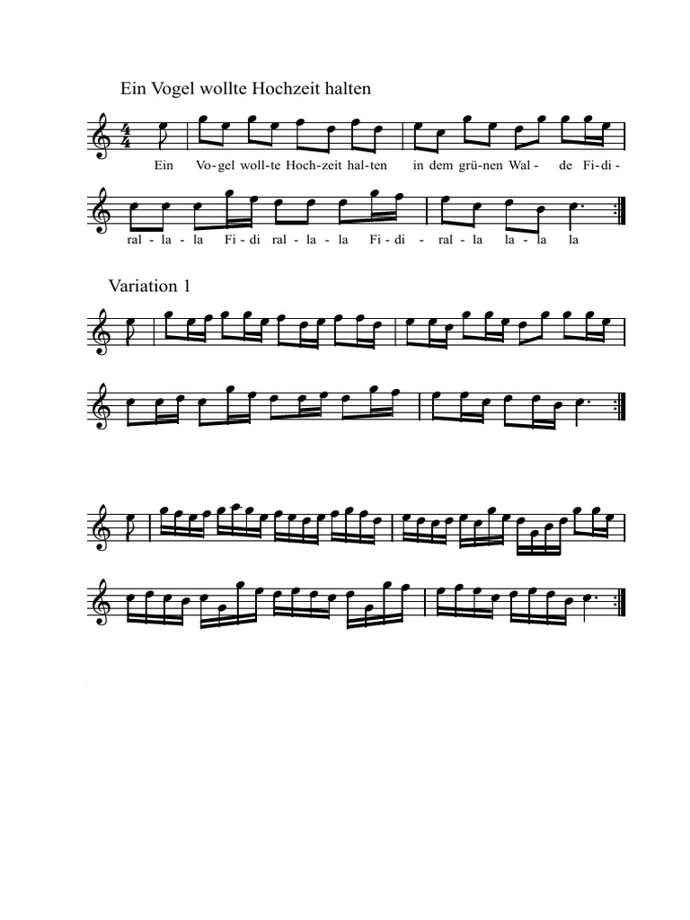 Ein vogel wollte hochzeit machen in dem gruenen walde. A e a e a fidi ralla la fidi ralla la fidi ralla ralla la a e a e 3. Die lerche die lerche die fuehrt die braut zur kirche.